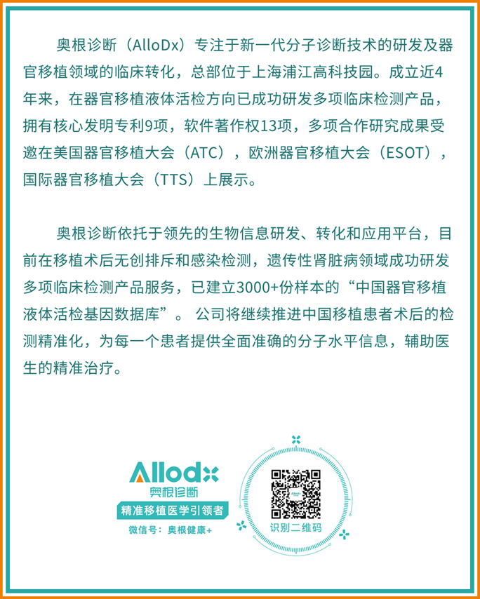 东部战区总医院肾脏病中心和奥根诊断共同合作,研究了肾移植患者血浆和尿液中的ddcfDNA(供体来源游离DNA)在辨别诊断排斥损伤类型中作用。此项研究将以Oral Presentation的形式与参会者分享【9月15日上午7:30,北京时间】。