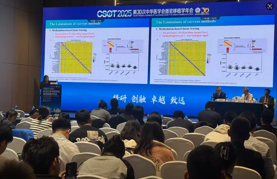 本届移植年会上,奥根诊断带来团队最新研发成果——第二代液体活检技术cPRISM-seq(Cis-Parallel Read Integrated SNP and Methylation Sequencing)。与传统的cfDNA甲基化溯源方法不同,该技术实现了在同一reads上同步捕获SNP与甲基化双重标记,将传统溯源方法的精准度提升了一个数量级——将原有高达20%的溯源误差大幅降低至1%,标志着无创dd-cfDNA检测正实现从1.0“检测总量”时代,向2.0“溯源定位”时代的跨越。(报告题目:《基于cPRISM-seq技术的ddcfDNA诊断胰肾联合移植术后器官特异性损伤》)